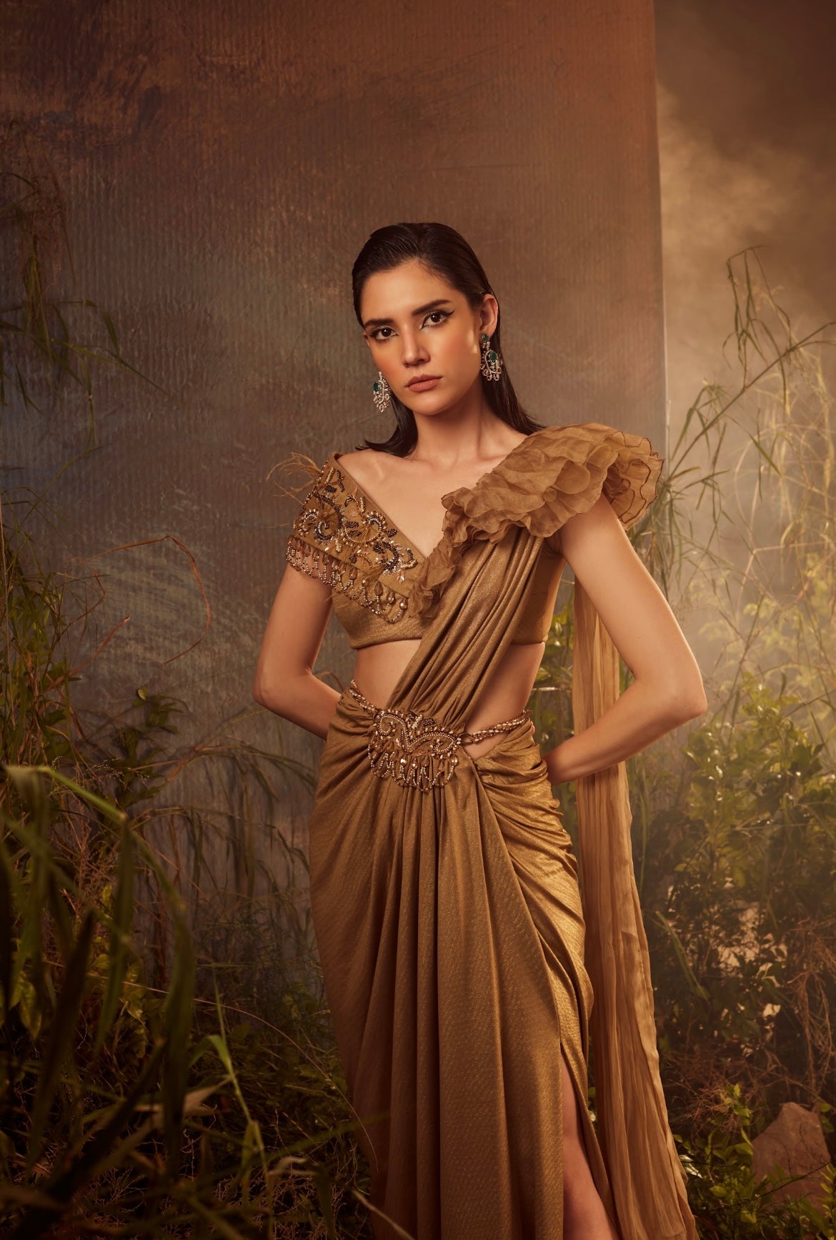 Hand Embroidered metallic gold blouse with embroidered waist belt saree set.