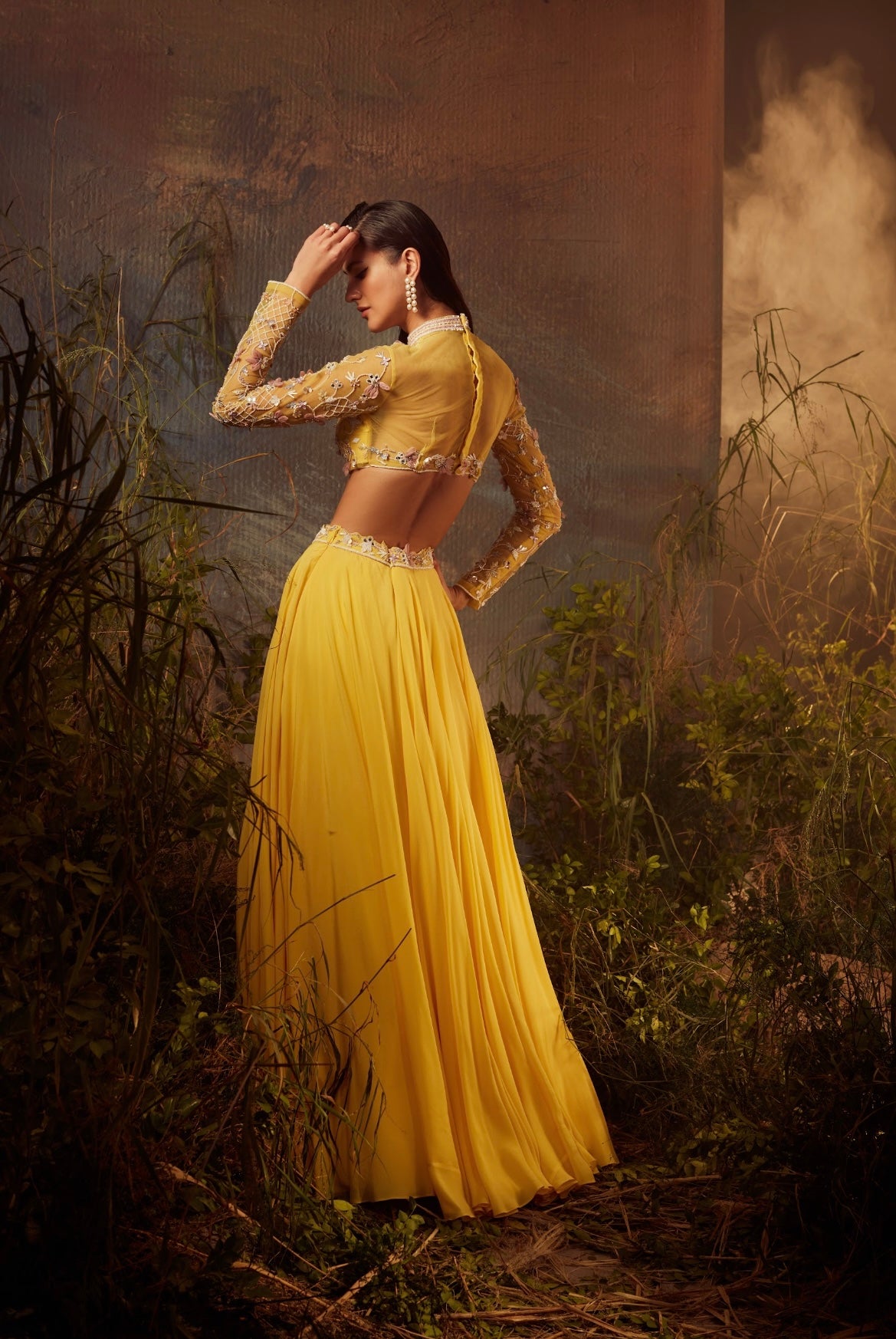 Hand embroidered blouse and saree that’s comes with georgette pre stitched pleats. It comes with a structured sleeve a classy dramatic effcet to the look.