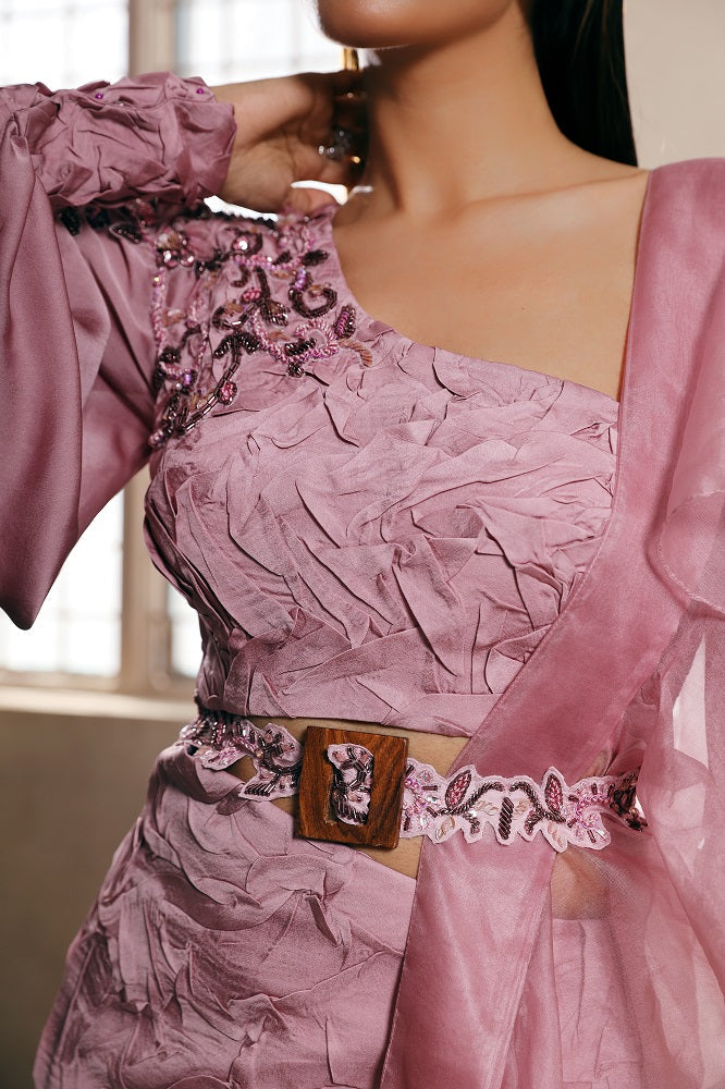 Mulberry pink satin-textured tunic with flare cut bell-bottom pants. It comes with a ruffled dupatta and a hand-embroidered scalloped edge belt with a buckle. It has an embroidered shoulder blade...