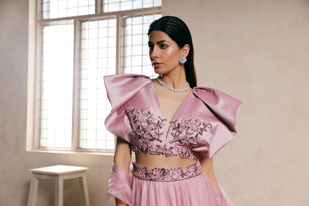 Lilac Taffeta Silk Embroidered blouse with Lehenga set Lilac Taffeta Silk Embroidered blouse with Lehenga set