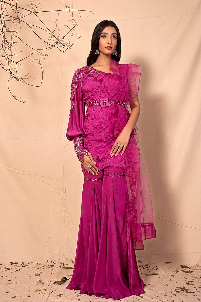 Mulberry Pink Knee Length textured tunic with Sharara and ruffle dupatta Mulberry Pink Knee Length textured tunic with Sharara and ruffle dupatta