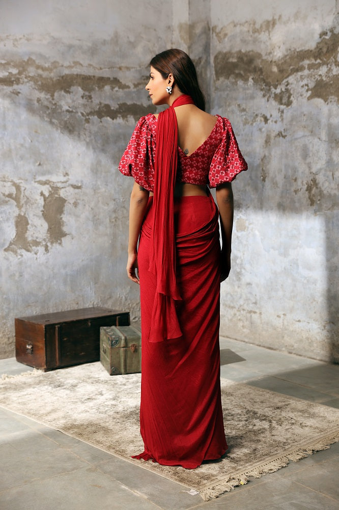 Ruby red slit pre stiched saree with printed balloon sleeves blouse Ruby red slit pre stiched saree with printed balloon sleeves blouse