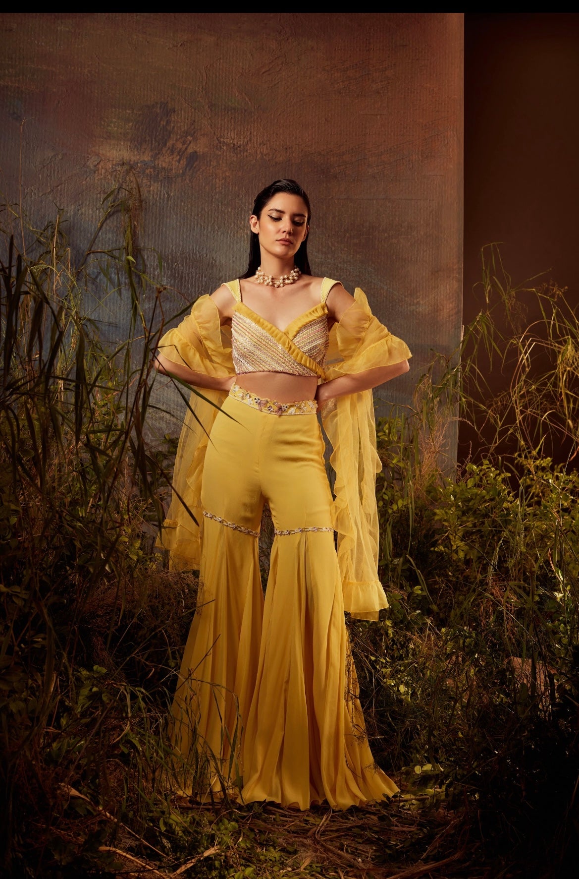 Yellow hand embroidered bralette that is paired with a modern cut sharara pants and ruffle dupatta.