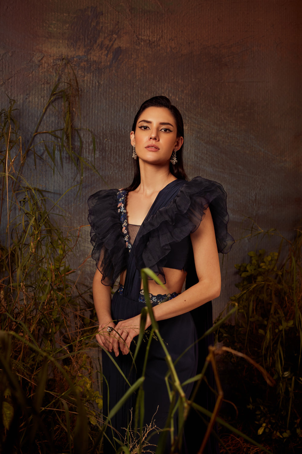 SELENE-Mid night blue embroidered structured shoulder saree gown SELENE-Mid night blue embroidered structured shoulder saree gown