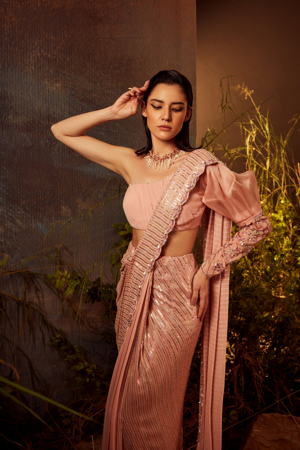 Hand embroidered blouse and saree that’s comes with georgette pre stitched pleats. It comes with a structured sleeve a classy dramatic effcet to the look.
