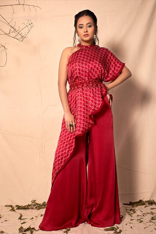 Ruby Red Printed one Shoulder Cape and Pants set with Embroidered Waist belt set Ruby Red Printed one Shoulder Cape and Pants set with Embroidered Waist belt set