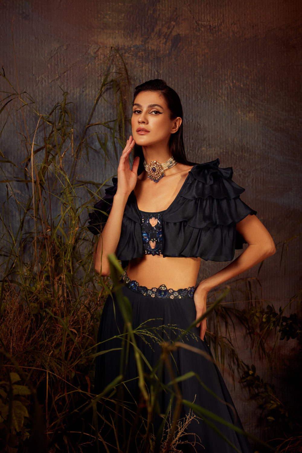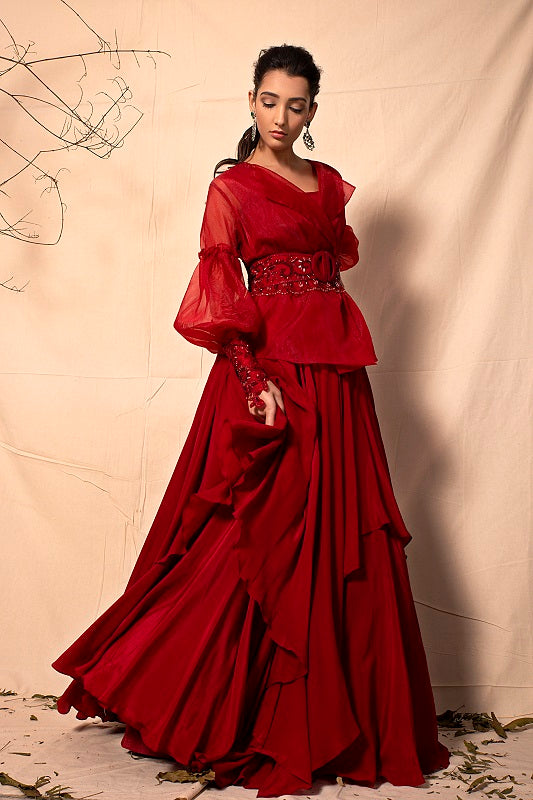 Purple color two layer peplum blouse with a little window cut at the front to add on the glam factor. Blouse is incricately hand embroidered with mirror, sequin, 3d organza leaves and embellishments. It is paied with kalidar sharara to make it suitable for all body types