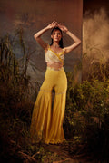 Yellow hand embroidered bralette that is paired with a modern cut sharara pants and ruffle dupatta.