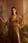 Hand Embroidered metallic gold organza cape with high slit drape skirt and a bustier set. You can style it with or without the belt.