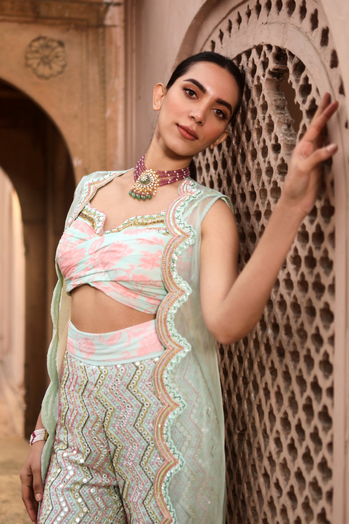 Embroidered beads & mirror work pants with scalop organza jacket and printed drape blouse set Color: Mint Green Fabric: Crepe, Georgette and Organza Wash Care: Dry Clean Only Delivery Date:...