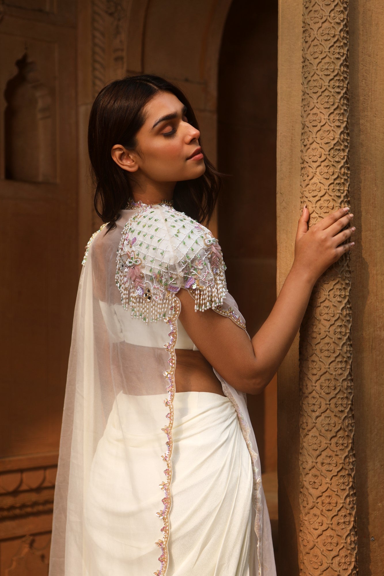 Embroidered structured beads and pearl detailing cape with drape saree set