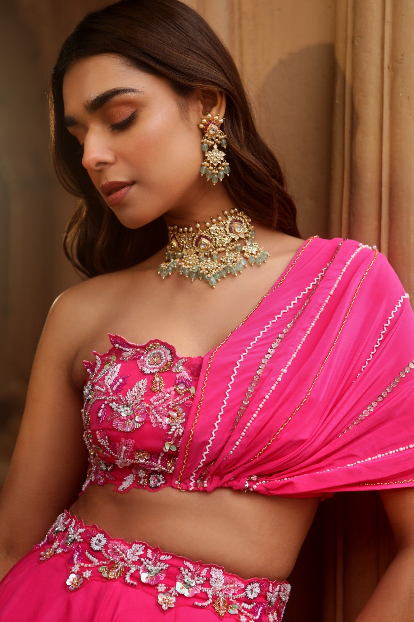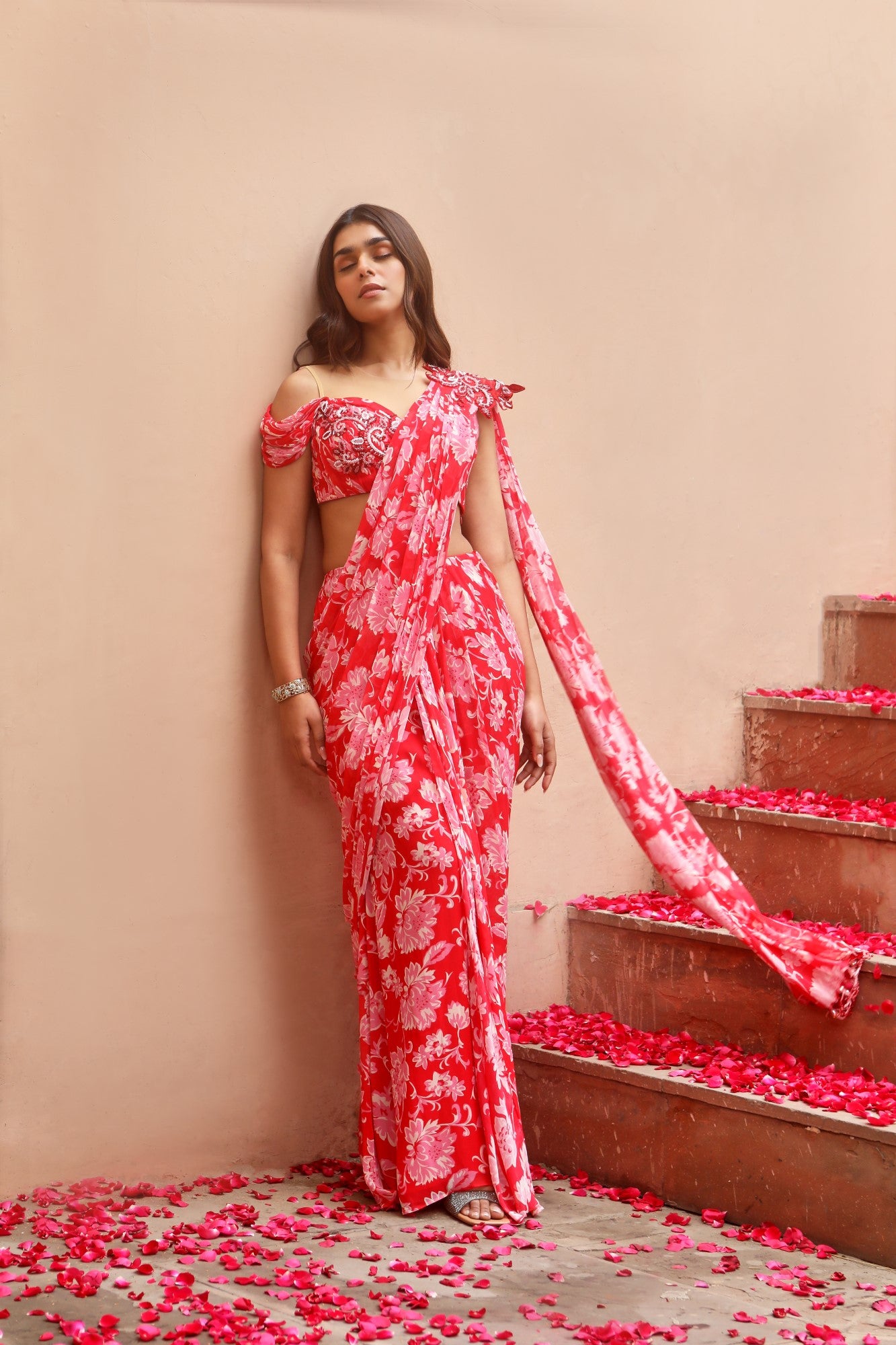 Embroidered beads and pearl work off shoulder printed blouse and drape saree set Color: Red Fabric: Georgette and Net Wash Care: Dry Clean Only Delivery Date: 4-5 weeks No Of...