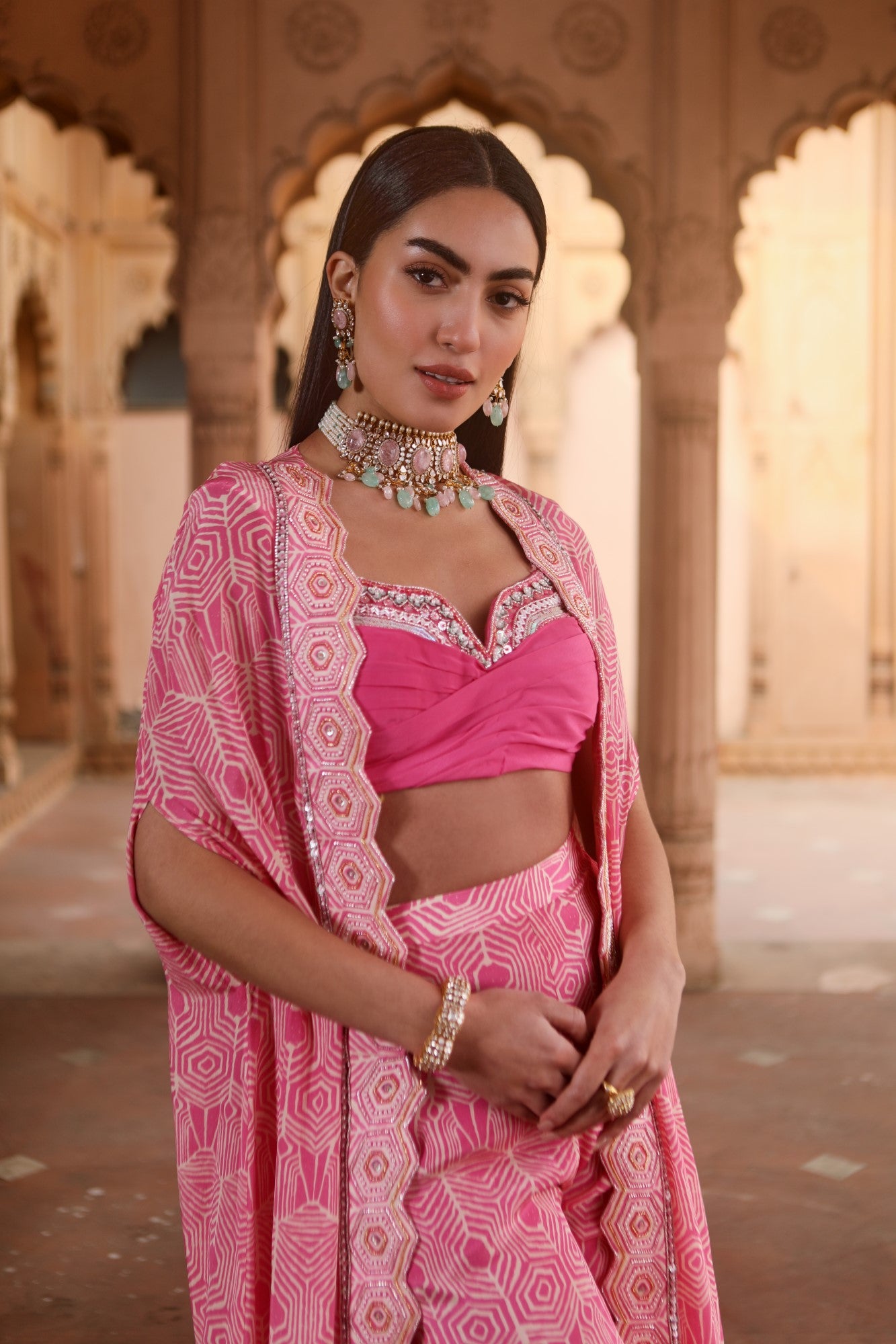 Embroidered blouse with highlighted printed cape and sharara pants set