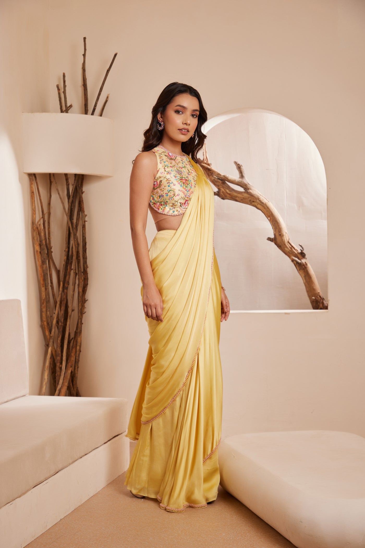 Embroidered multi color blouse with pre stitched drape saree set Color: Yellow Fabric: dupian silk , satin & net Wash Care: Dry Clean Only Delivery Date: 3 Weeks No Of Components:...