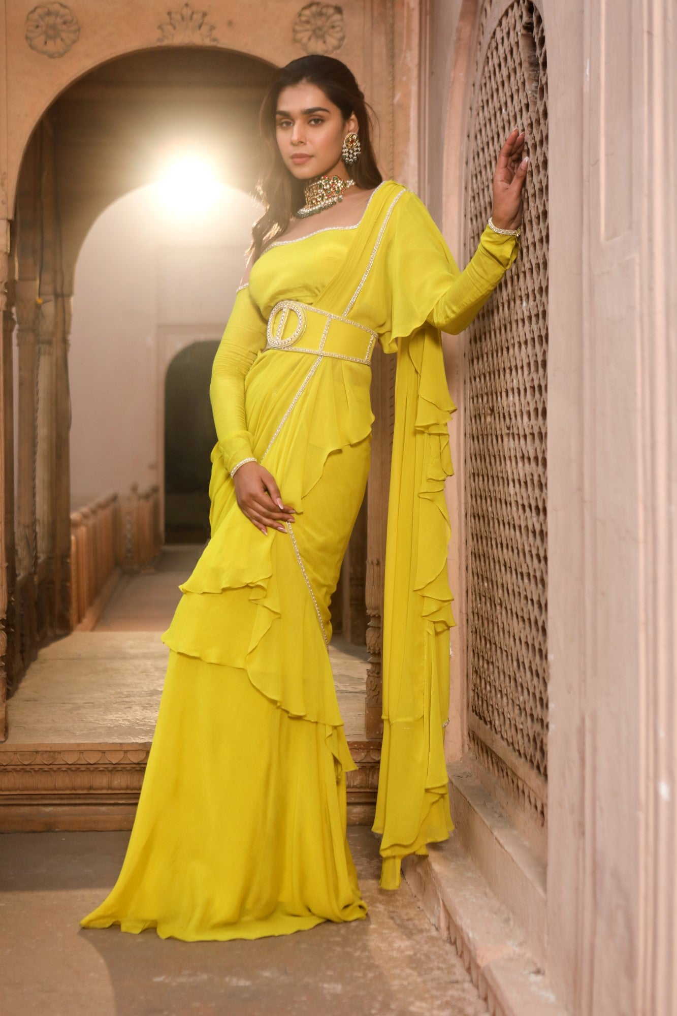 Embroidred beads detailing blouse and belt with a drape ruffle saree set