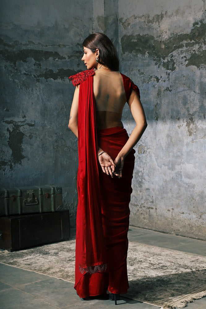 Red Pre stitched drape saree with hand Embroidered blouse and Tassled Pallu set Red Pre stitched drape saree with hand Embroidered blouse and Tassled Pallu set