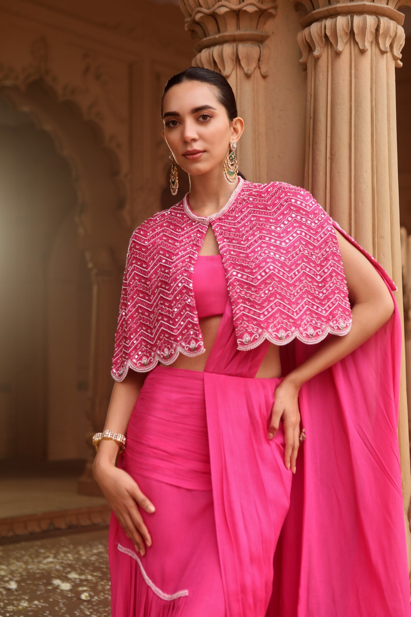Embrodiered mirror and beads works scalop cape with fusion drape saree set
