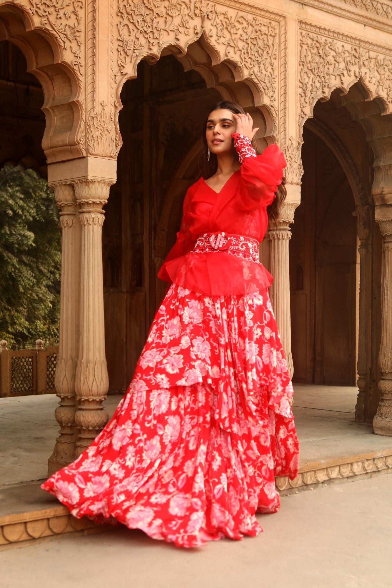 Scarlet Red Organza Jacket with Multi Asymmetric Layer Lehenga set Scarlet Red Organza Jacket with Multi Asymmetric Layer Lehenga set